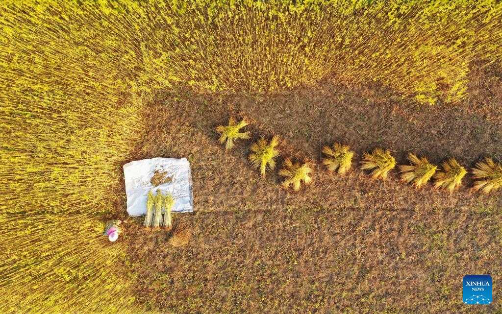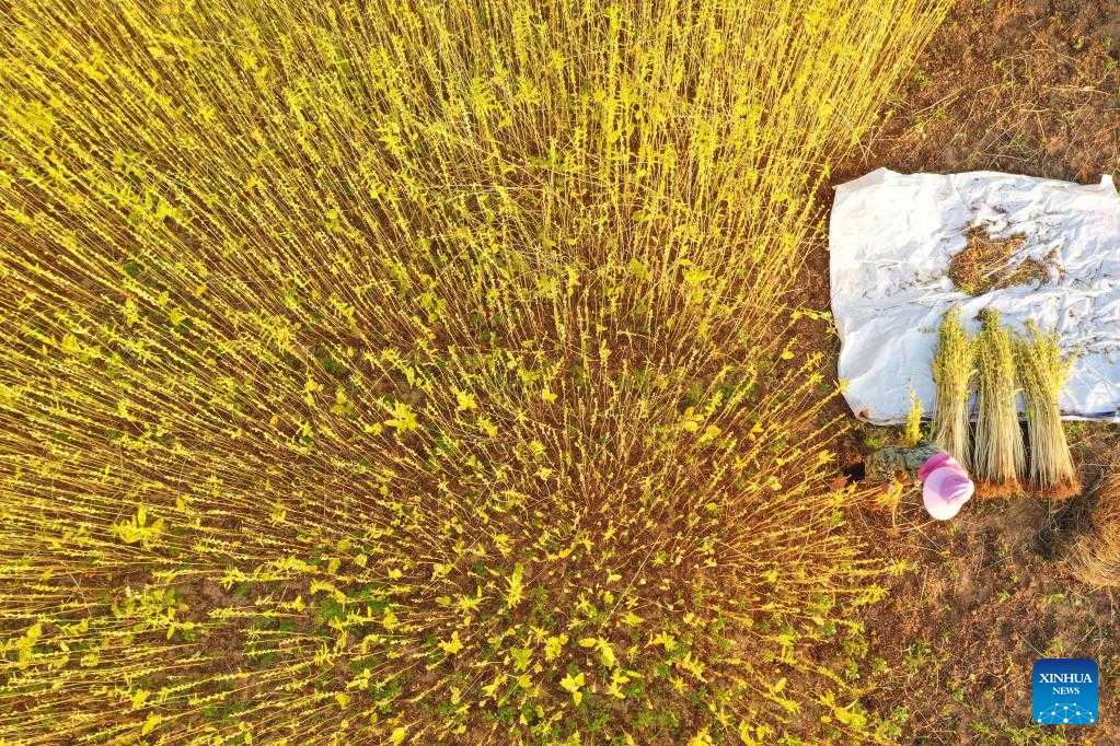 Aerial photo taken on Sept. 2, 2022 shows a villager harvesting seasame in a field in Donghu Village of Tangzhou Town in Taihe County, Ji'an of east China's Jiangxi Province. (Photo by Deng Heping/Xinhua)