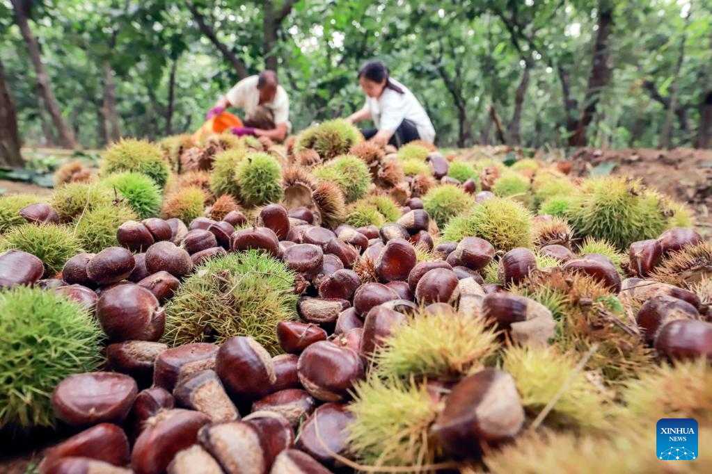 Villagers harvest chestnuts in Maojiachang Village of Xingwangzhai Town, Zunhua City of north China's Hebei Province, Sept. 4, 2022. (Photo by Liu Mancang/Xinhua)