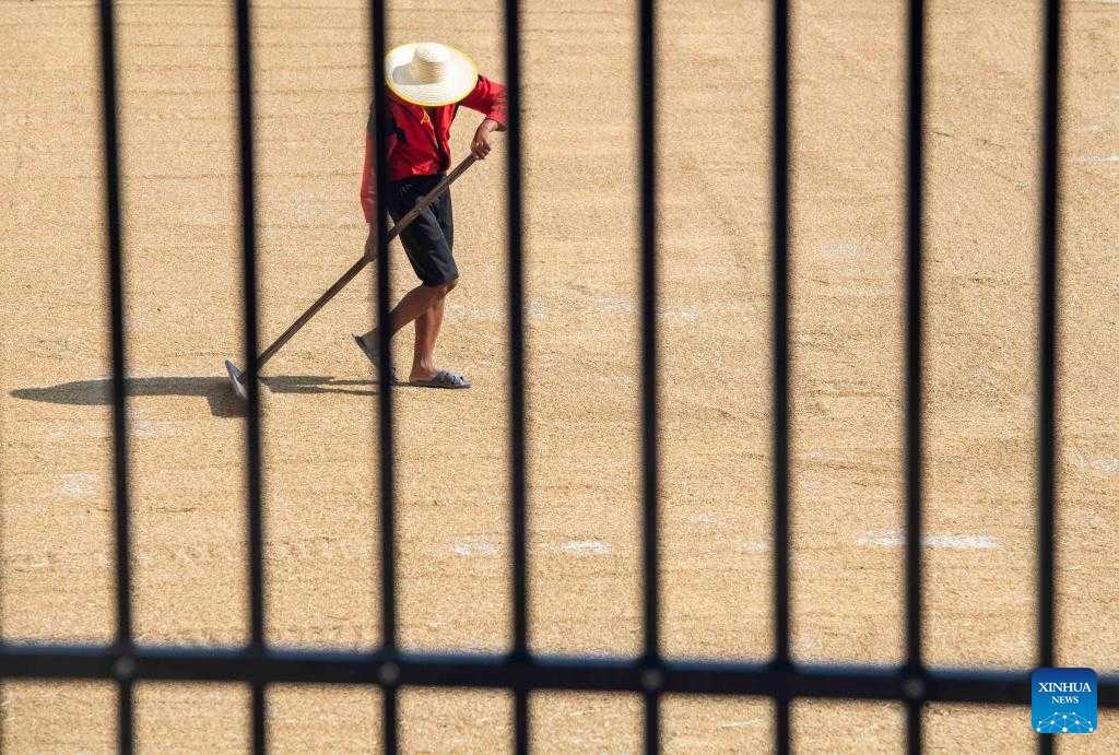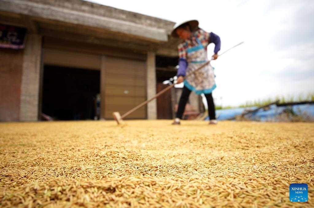 A villager airs rice in Yangjia Village of Danzhai County, Qiandongnan Miao and Dong Autonomous Prefecture, southwest China's Guizhou Province, Sept. 4, 2022. (Photo by Huang Xiaohai/Xinhua)
