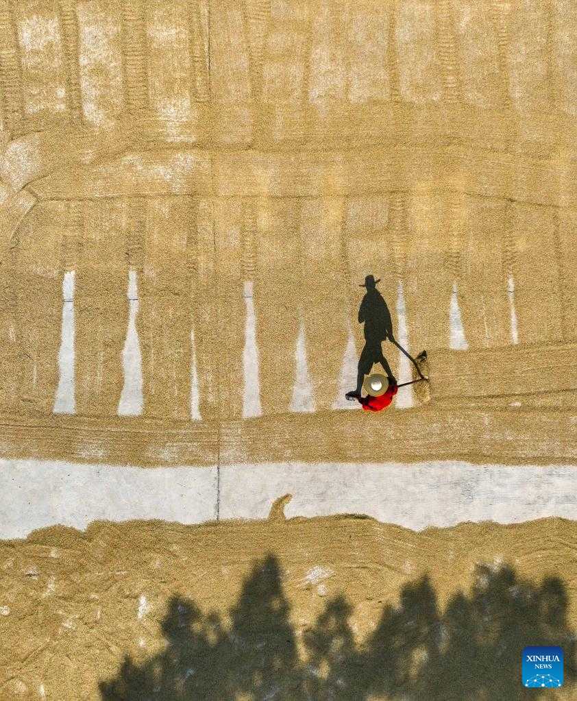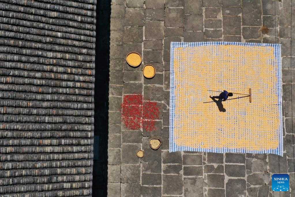 Aerial photo taken on Sept. 4, 2022 shows a villager airing rice in Zhongping Village of Qingtang Town in Daoxian County, Yongzhou City, central China's Hunan Province. (Photo by Jiang Keqing/Xinhua)