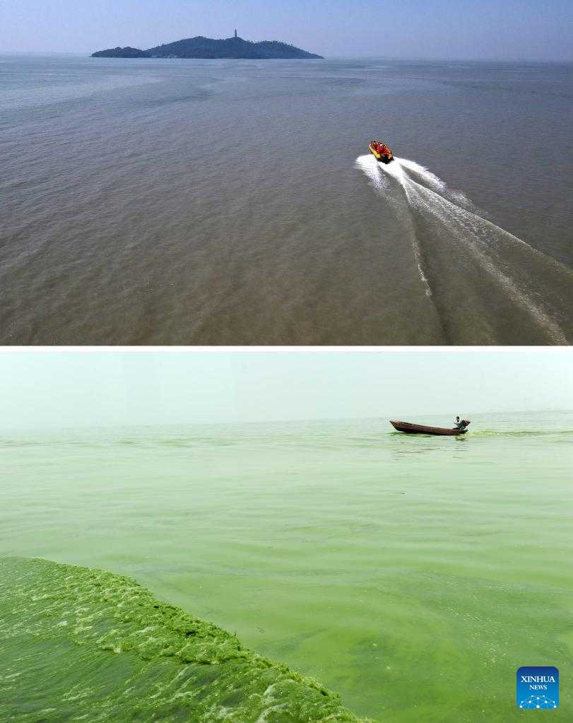 Combo photo shows an aerial view of a boat sailing on the Chaohu Lake on Sept. 6, 2022 (upper) and a boat sailing on the Chaohu Lake in Hefei City, east China's Anhui Province, June 9, 2012. As the fifth-largest freshwater lake in China, Chaohu Lake is known as the "kidney" of the Yangtze River.