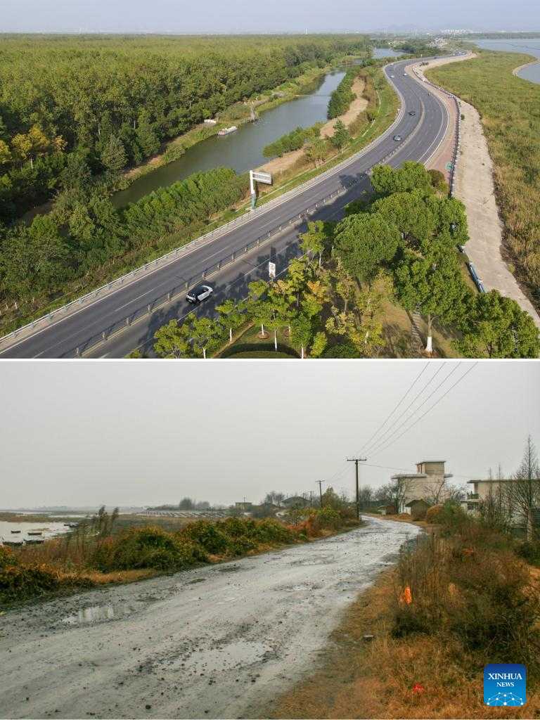 Combo photo shows a road beside the Chaohu Lake on Sept. 6, 2022 (upper, Xinhua/Zhang Duan) and a road beside the Chaohu Lake in Hefei City, east China's Anhui Province in 2007 (file photo). As the fifth-largest freshwater lake in China, Chaohu Lake is known as the "kidney" of the Yangtze River.