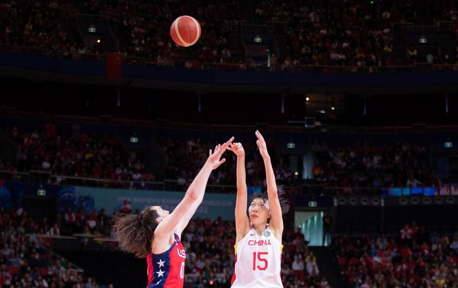 Han Xu (R) of China shoots the ball during the final against the United States at the FIBA Women's Basketball World Cup 2022 in Sydney, Australia, Oct. 1, 2022. (Photo by Hu Jingchen/Xinhua)
