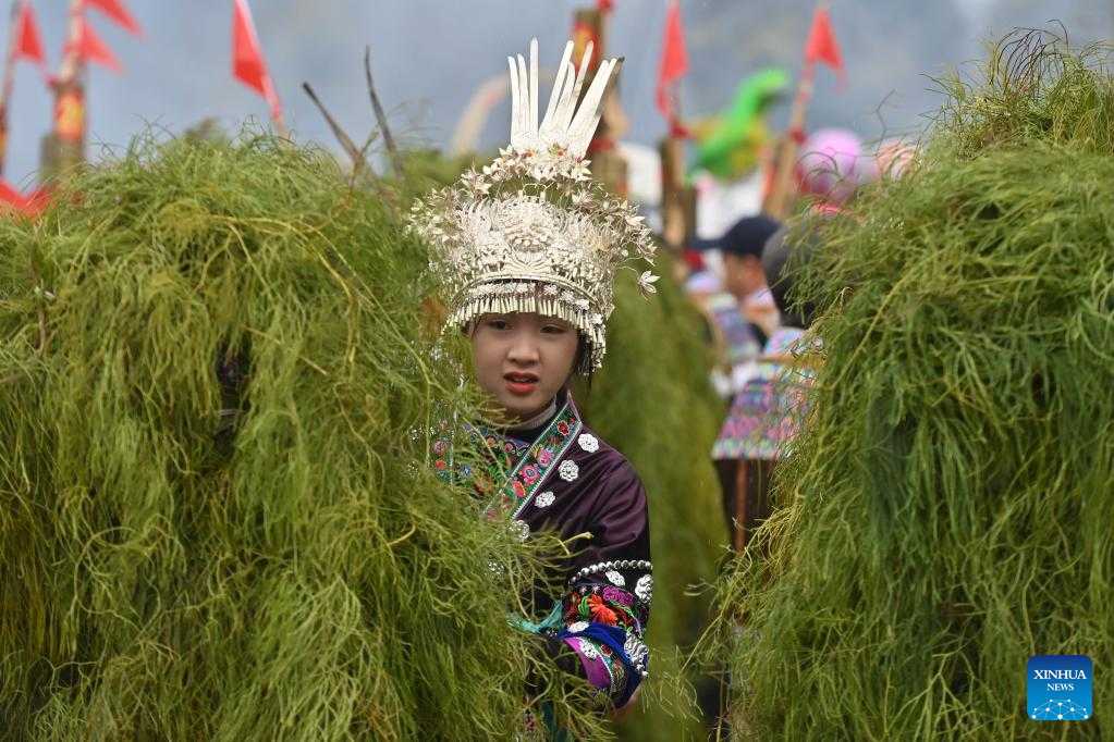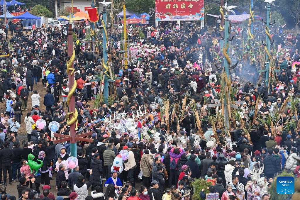 Local people are pictured before the "pohui" festival in Xiangfen Town of Rongshui Miao Autonomous County, south China's Guangxi Zhuang Autonomous Region, Feb. 6, 2023. Since the Spring Festival, villages in Rongshui Miao Autonomous County have held various activities to celebrate the "pohui" festival, a traditional festival observed by the Miao ethnic minority, and to boost local tourism. (Xinhua/Huang Xiaobang)