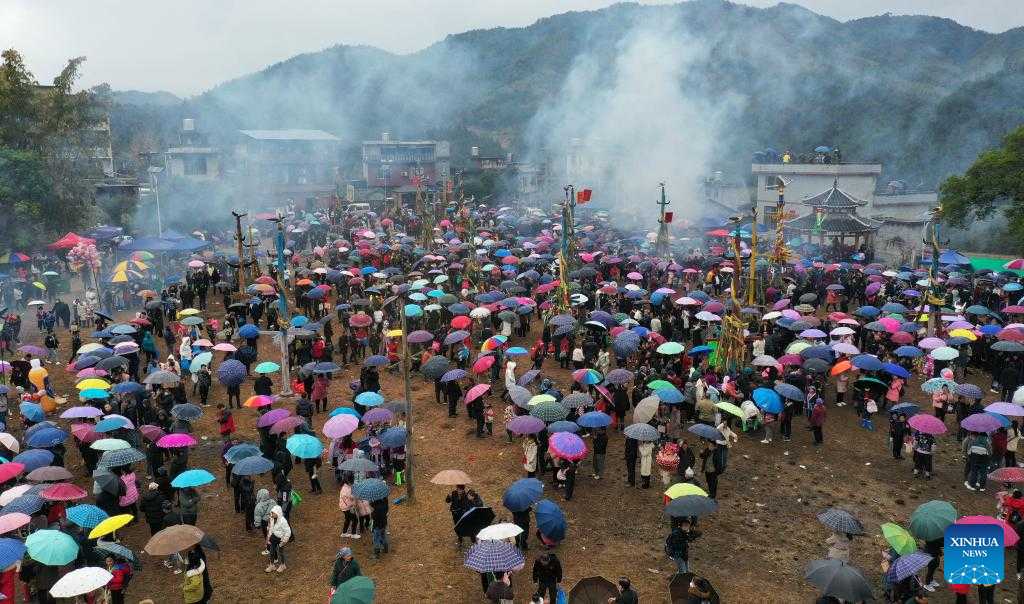 This aerial photo taken on Feb. 6, 2023 shows people of the Miao ethnic group dancing with "Lusheng", a traditional reed-pipe wind instrument, during the "pohui" festival in Xiangfen Town of Rongshui Miao Autonomous County, south China's Guangxi Zhuang Autonomous Region. Since the Spring Festival, villages in Rongshui Miao Autonomous County have held various activities to celebrate the "pohui" festival, a traditional festival observed by the Miao ethnic minority, and to boost local tourism. (Xinhua/Huang Xiaobang)