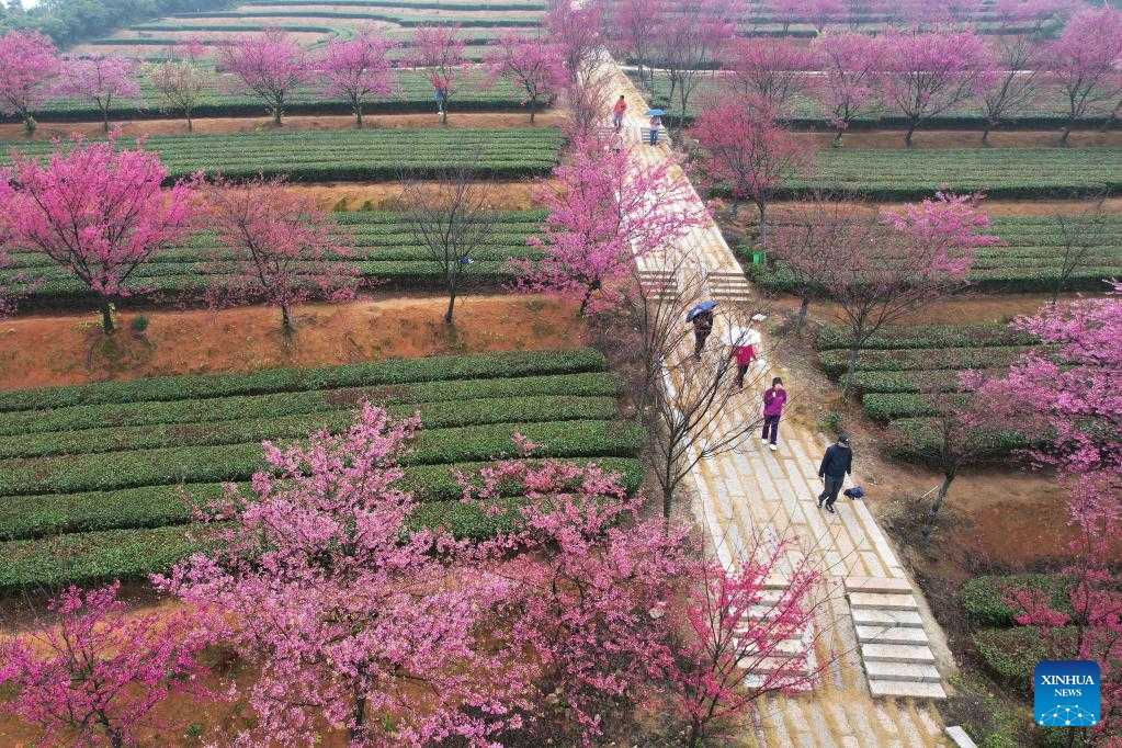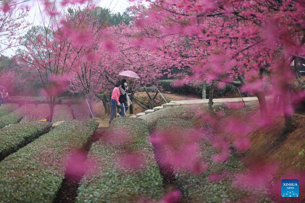 Tourists view cherry blossoms in a tea garden in Xiang'an District of Xiamen, southeast China's Fujian Province, on Feb. 4, 2023. (Photo by Zeng Demeng/Xinhua)