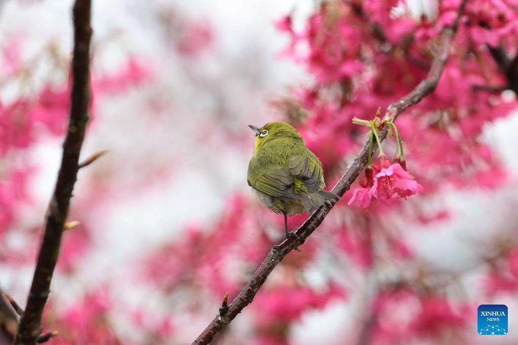 This photo taken on Feb. 4, 2023 shows a white-eye bird perching on a cherry tree in a tea garden in Xiang'an District of Xiamen, southeast China's Fujian Province. (Photo by Zeng Demeng/Xinhua)