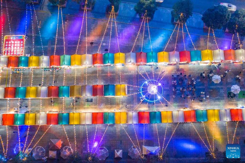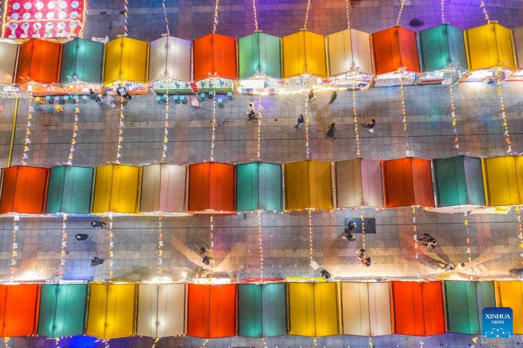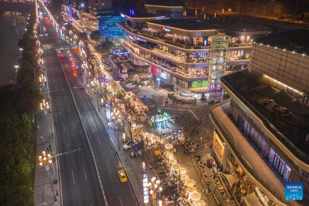 This aerial photo taken on Feb. 9, 2023 shows a night fair in Nan'an District in southwest China's Chongqing Municipality. Chongqing has launched a variety of activities at nighttime to boost night economy since the beginning of this year. (Xinhua/Huang Wei)