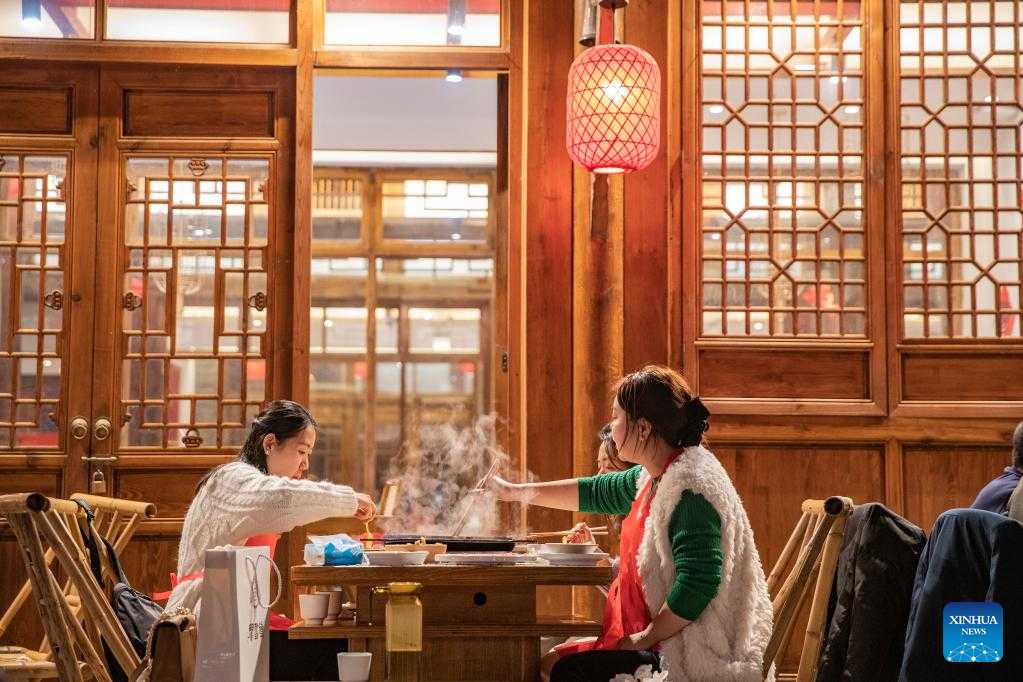 Tourists eat Chongqing hotpot at a traditional scenic area in Yuzhong District in southwest China's Chongqing Municipality, Feb. 10, 2023. Chongqing has launched a variety of activities at nighttime to boost night economy since the beginning of this year. (Xinhua/Huang Wei)