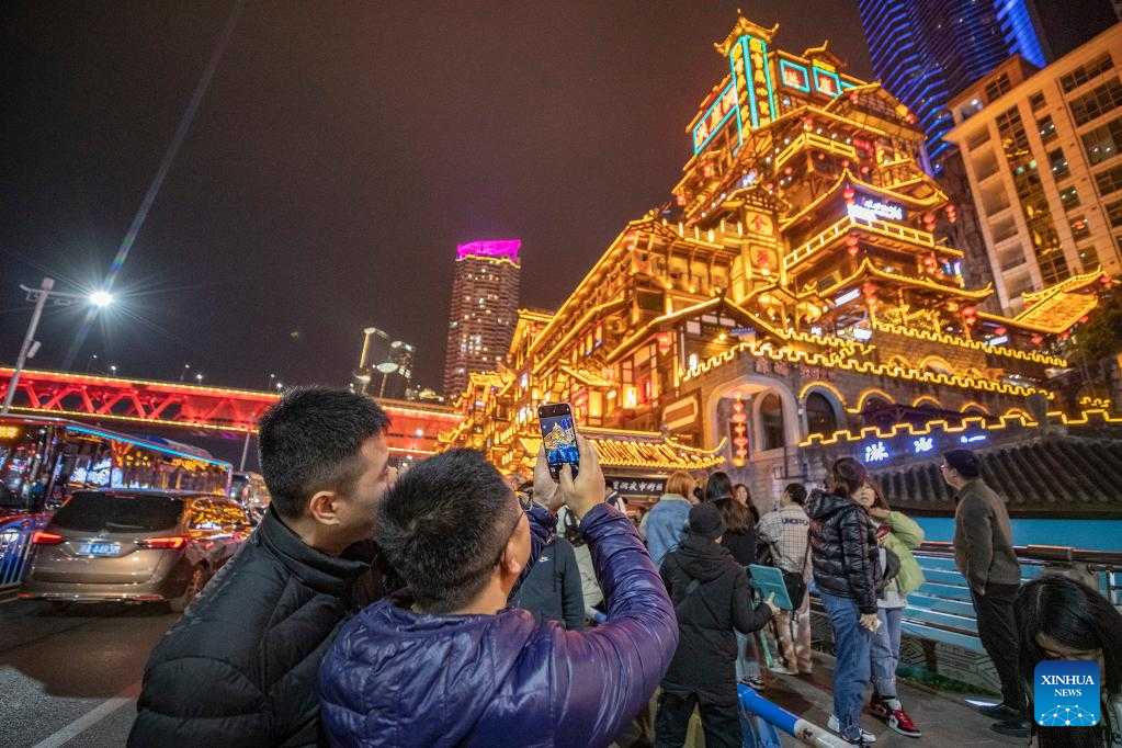 Tourists visit a traditional scenic area in Yuzhong District in southwest China's Chongqing Municipality, Feb. 10, 2023. Chongqing has launched a variety of activities at nighttime to boost night economy since the beginning of this year. (Xinhua/Huang Wei)