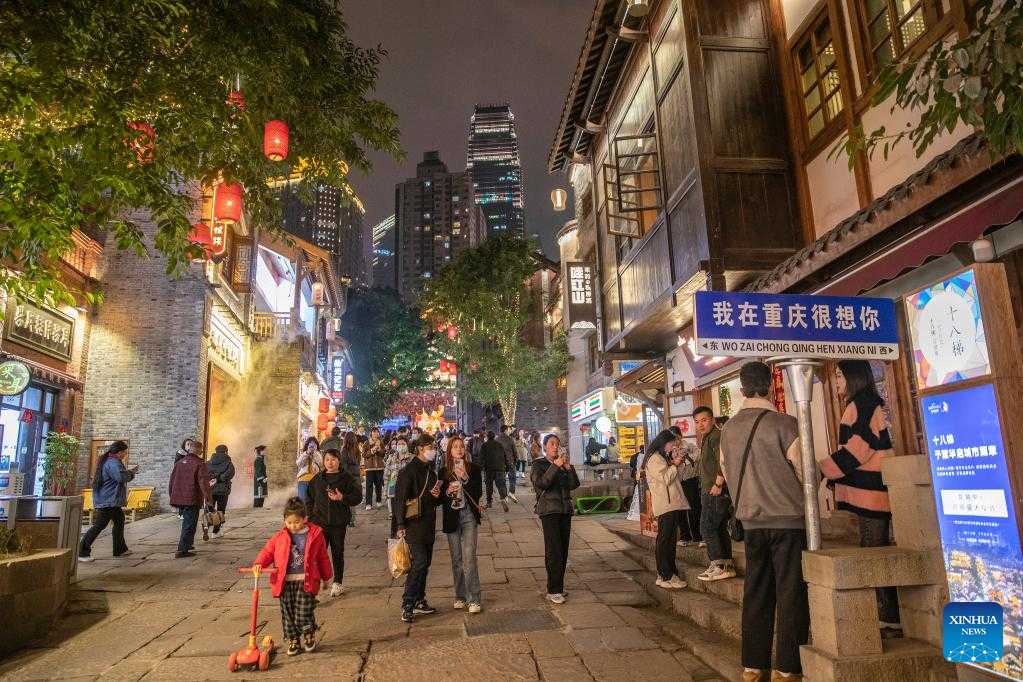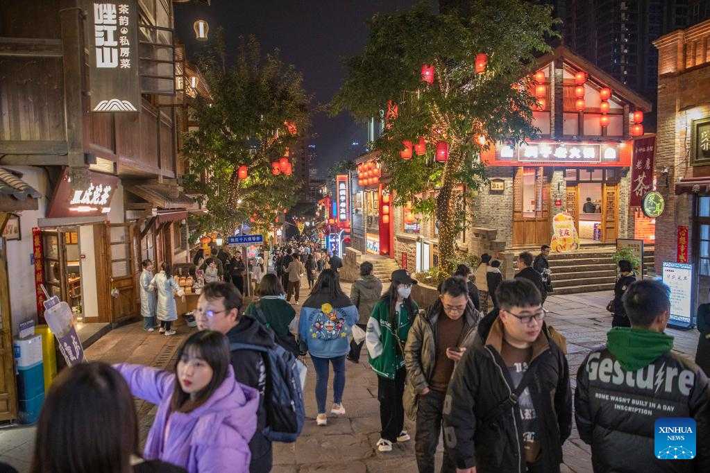 Tourists visit a commercial street in Yuzhong District in southwest China's Chongqing Municipality, Feb. 10, 2023. Chongqing has launched a variety of activities at nighttime to boost night economy since the beginning of this year. (Xinhua/Huang Wei)