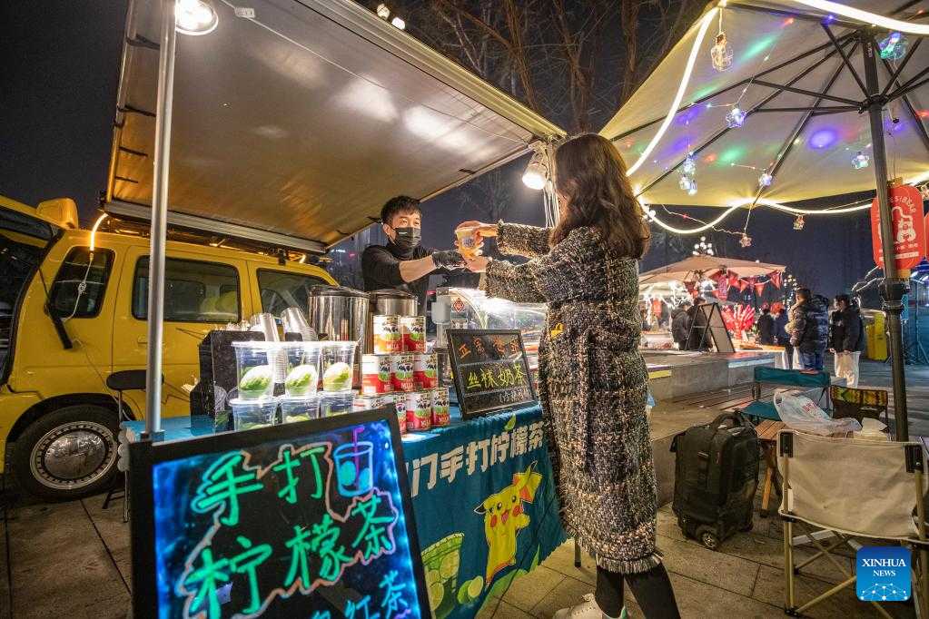 A vendor passes drink to a customer at a night fair in Nan'an District in southwest China's Chongqing Municipality, Feb. 9, 2023. Chongqing has launched a variety of activities at nighttime to boost night economy since the beginning of this year. (Xinhua/Huang Wei)