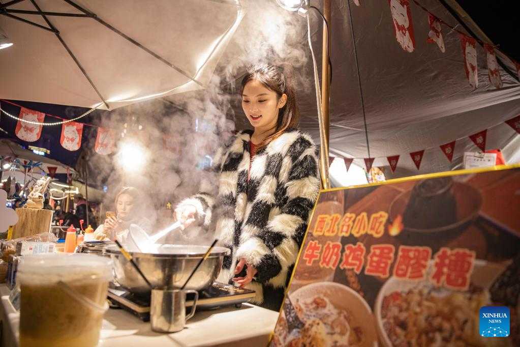 A vendor cooks at a night fair in Nan'an District in southwest China's Chongqing Municipality, Feb. 9, 2023. Chongqing has launched a variety of activities at nighttime to boost night economy since the beginning of this year. (Xinhua/Huang Wei)
