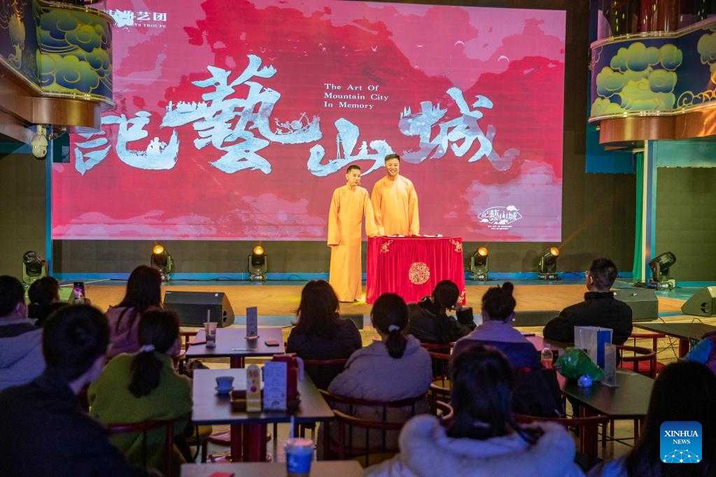 Chinese Xiangsheng or crosstalk artists perform at a traditional scenic area in Yuzhong District in southwest China's Chongqing Municipality, Feb. 10, 2023. Chongqing has launched a variety of activities at nighttime to boost night economy since the beginning of this year. (Xinhua/Huang Wei)