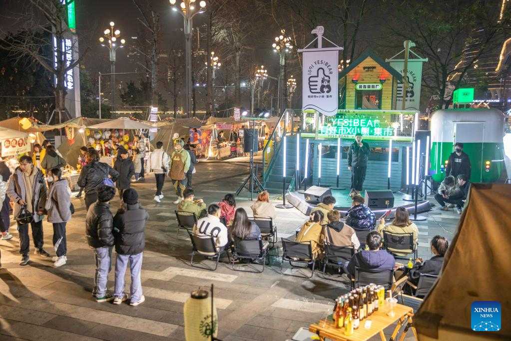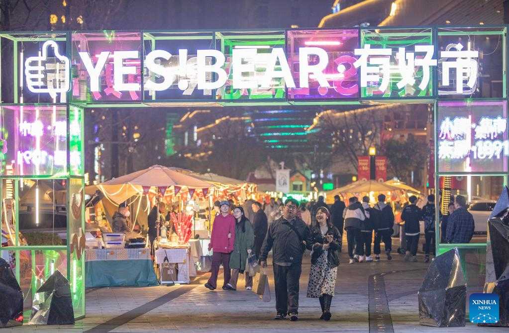 Tourists have fun at a night fair in Nan'an District in southwest China's Chongqing Municipality, Feb. 9, 2023. Chongqing has launched a variety of activities at nighttime to boost night economy since the beginning of this year. (Xinhua/Huang Wei)