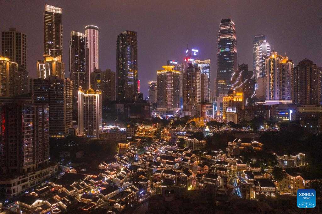 This aerial photo taken on Feb. 10, 2023 shows a night view of Yuzhong District in southwest China's Chongqing Municipality. Chongqing has launched a variety of activities at nighttime to boost night economy since the beginning of this year. (Xinhua/Huang Wei)