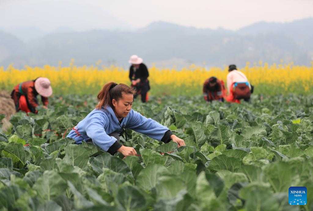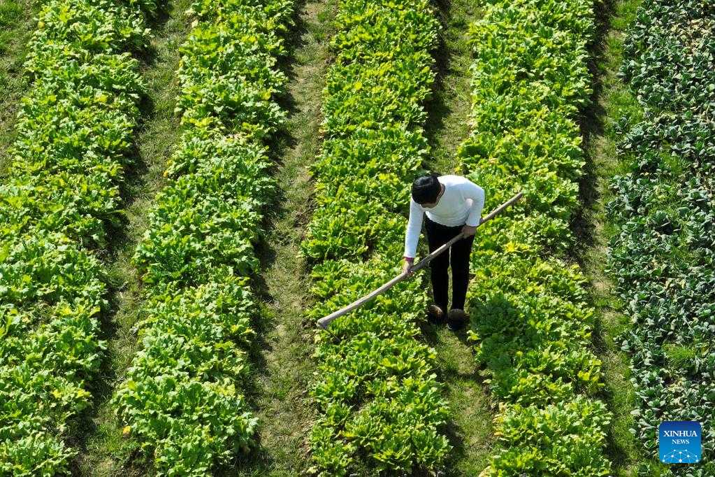 Farmers take care of vegetables in a field in Guandong Township of Congjiang County, Qiandongnan Miao and Dong Autonomous Prefecture, southwest China's Guizhou Province, Feb. 18, 2023. (Photo by Luo Jinglai/Xinhua)