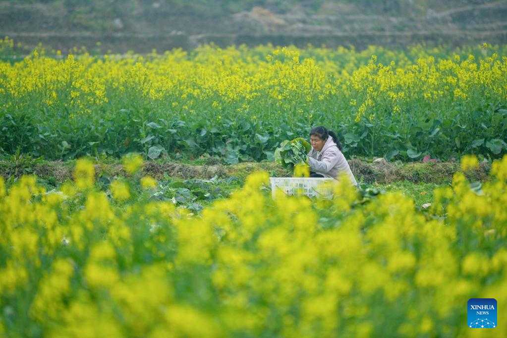 A villager harvests vegetables in Manxi Village of Zunyi, southwest China's Guizhou Province, Feb. 18, 2023. (Photo by Zhou Lei/Xinhua)