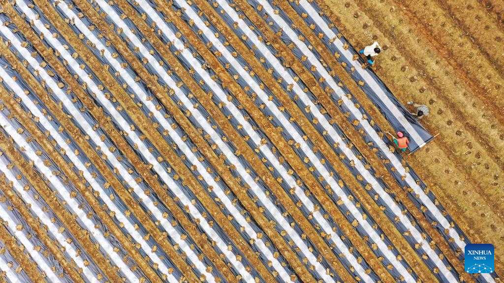 This aerial photo taken on Feb. 18, 2023 shows farmers mulching a crop field in Xintian County of Yongzhou, central China's Hunan Province. (Photo by Liu Guixiong/Xinhua)