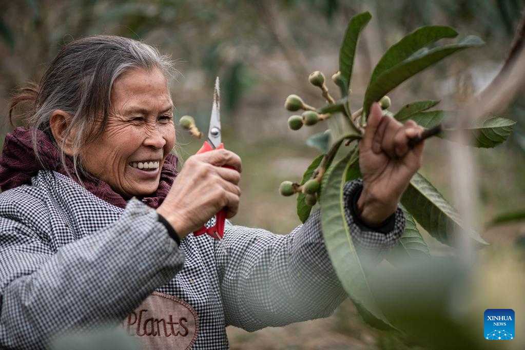 A villager prunes a fruit tree in Duanqiao Town of Guanling Buyi and Miao Autonomous County, southwest China's Guizhou Province, Feb. 18, 2023. (Photo by Song Chaohui/Xinhua)