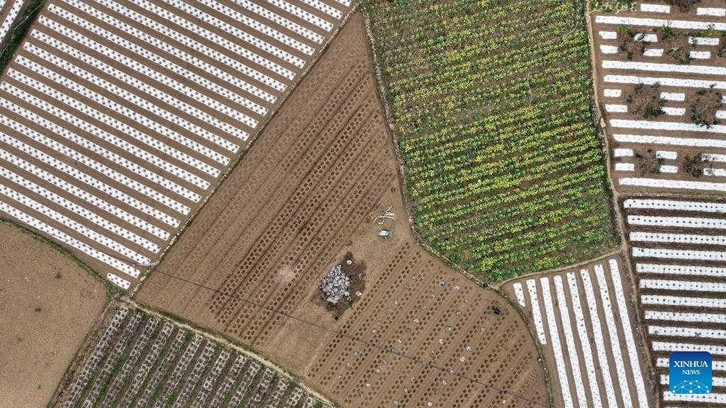 This aerial photo taken on Feb. 18, 2023 shows villagers working at a vegetable base in Duanqiao Town of Guanling Buyi and Miao Autonomous County, southwest China's Guizhou Province. Yushui (Rain Water), the second of China's 24 solar terms, falls on Feb. 19 in the year 2023. The arrival of Yushui will see rises in temperature, more frequent rainfall, and a wave of spring farming activities across China. (Xinhua/Yang Ying)