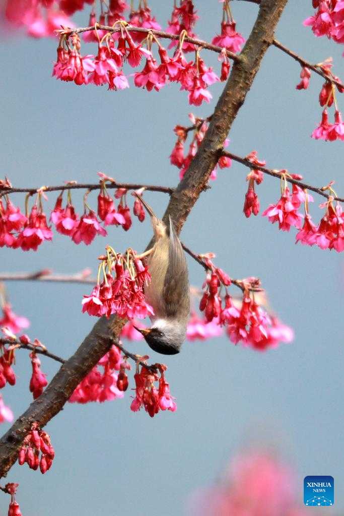 A bird forages on a cherry tree in Jieya Village of Jiuwanxi Town, Zigui County, central China's Hubei Province, Feb. 27, 2023. (Photo by Wang Gang/Xinhua)