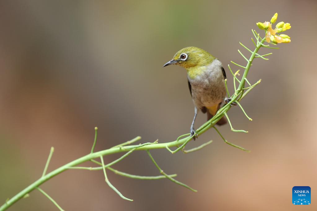 This photo taken on Feb. 28, 2023 shows a bird perching on a cole flower sprig in Yanfeng district of Hengyang, central China's Hunan Province. (Photo by Cao Zhengping/Xinhua)