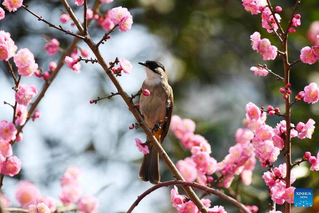 A bird perches on a plum tree branch in Renhuai, southwest China's Guizhou Province, Feb. 27, 2023. (Photo by Chen Yong/Xinhua)