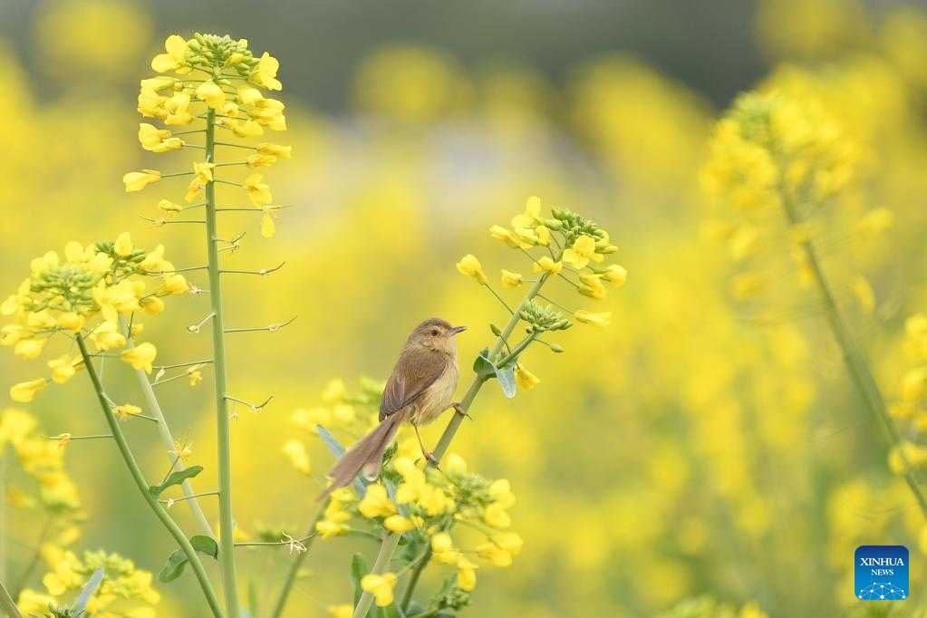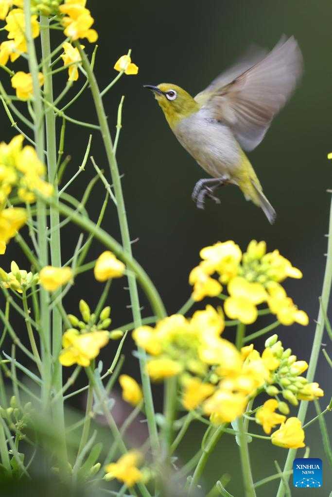 This photo taken on Feb. 28, 2023 shows a bird fluttering its wings among cole flowers in Yanfeng district of Hengyang, central China's Hunan Province. (Photo by Cao Zhengping/Xinhua)