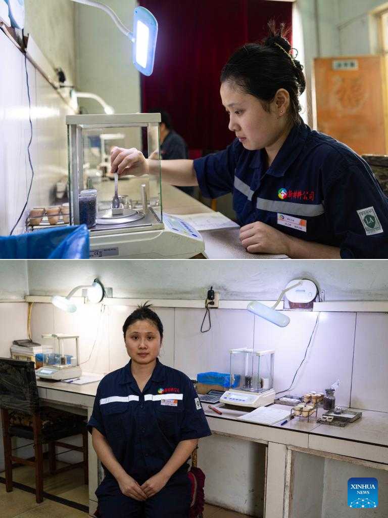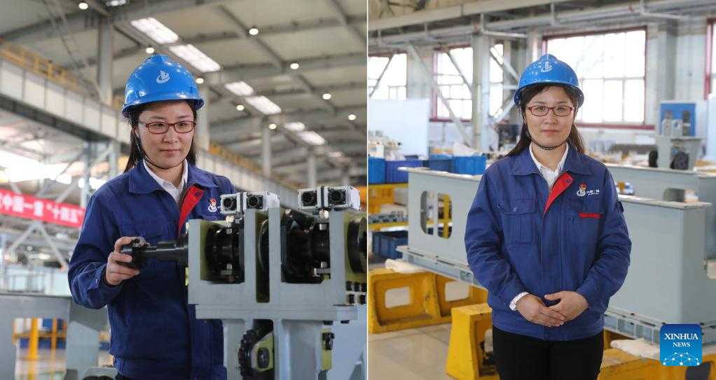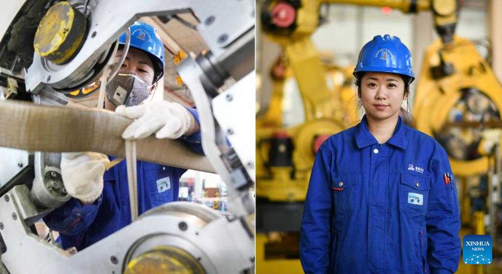 This combo photo shows technician Song Mingjing working (L) and posing for a photo at a workshop of China First Heavy Industries (CFHI) in Qiqihar, northeast China's Heilongjiang Province, March 6, 2023. Enterprises in Heilongjiang Province, an old industrial base in northeast China, have been making headway towards the goal of making a good start in the first quarter of 2023.