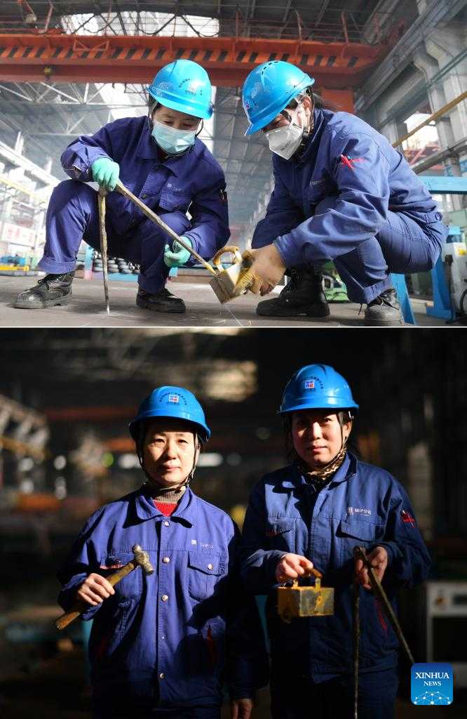 This combo photo shows workers Liu Li (L) and Liu Lili working (above) and posing for a photo at Harbin Boiler Company Ltd. of Harbin Electric Corporation in Harbin, northeast China's Heilongjiang Province, March 6, 2023. Enterprises in Heilongjiang Province, an old industrial base in northeast China, have been making headway towards the goal of making a good start in the first quarter of 2023.