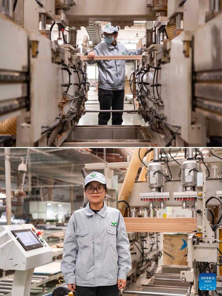 This combo photo shows worker Lu Wei working (above) and posing for a photo at a furniture manufacturing company in Qitaihe, northeast China's Heilongjiang Province, March 7, 2023. Enterprises in Heilongjiang Province, an old industrial base in northeast China, have been making headway towards the goal of making a good start in the first quarter of 2023.