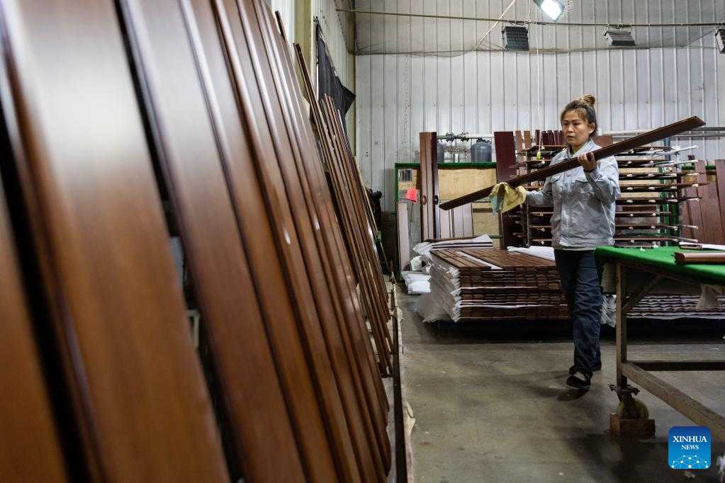 Zhu Yawei is at work at a furniture manufacturing company in Qitaihe, northeast China's Heilongjiang Province, March 7, 2023. Enterprises in Heilongjiang Province, an old industrial base in northeast China, have been making headway towards the goal of making a good start in the first quarter of 2023.