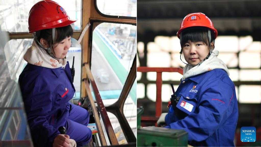 This combo photo shows crane operator Li Yinan working (L) and posing for a photo at a workshop of Harbin Electric Machinery Company Ltd. of Harbin Electric Corporation in Harbin, northeast China's Heilongjiang Province, March 6, 2023. Enterprises in Heilongjiang Province, an old industrial base in northeast China, have been making headway towards the goal of making a good start in the first quarter of 2023.