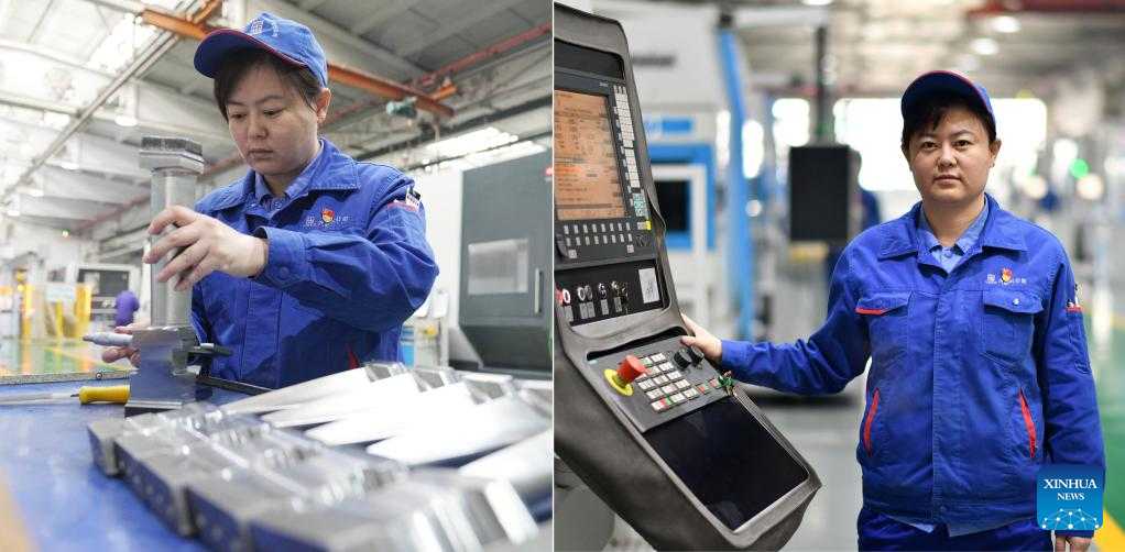 This combo photo shows computer numerical control (CNC) machinist Ge Dan working (L) and posing for a photo at a workshop of Harbin Turbine Company Limited in Harbin, northeast China's Heilongjiang Province, March 7, 2023. Enterprises in Heilongjiang Province, an old industrial base in northeast China, have been making headway towards the goal of making a good start in the first quarter of 2023.