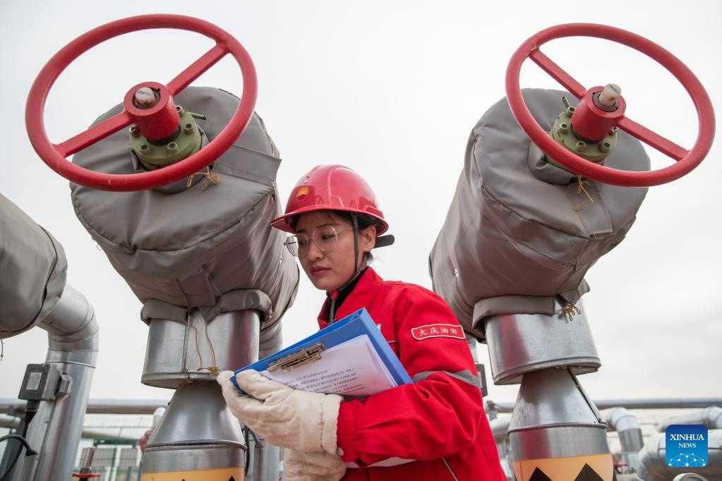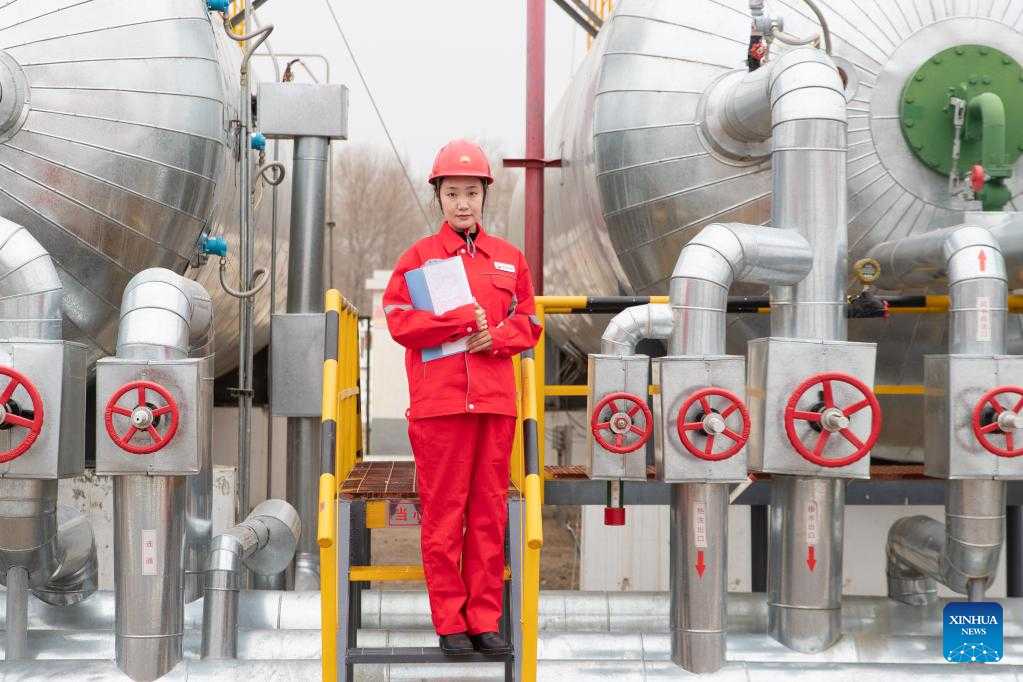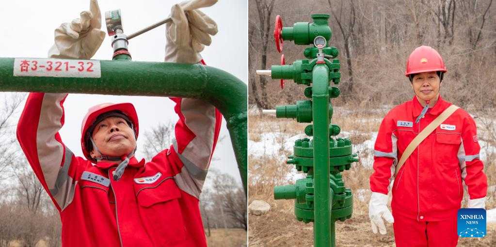 Oil worker Wang Lina is pictured at a working area of Daqing Oilfield in Daqing, northeast China's Heilongjiang Province, March 7, 2023. Enterprises in Heilongjiang Province, an old industrial base in northeast China, have been making headway towards the goal of making a good start in the first quarter of 2023.