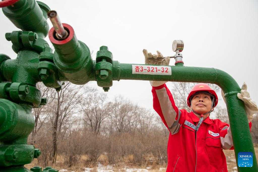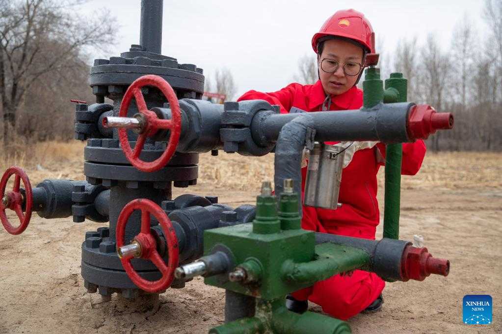 Worker Liu Baihan examines a working area of Daqing Oilfield in Daqing, northeast China's Heilongjiang Province, March 7, 2023. Enterprises in Heilongjiang Province, an old industrial base in northeast China, have been making headway towards the goal of making a good start in the first quarter of 2023.