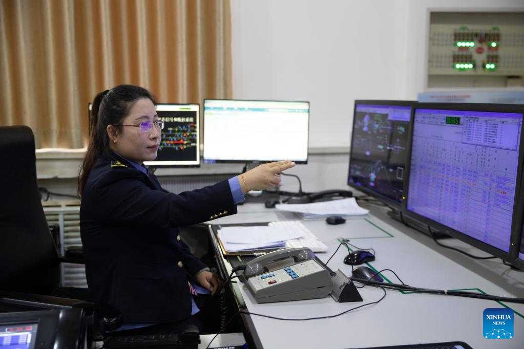 Railway station staff member Liu Yang is pictured on duty at Daqing West Railway Station in Daqing, northeast China's Heilongjiang Province, March 7, 2023. Enterprises in Heilongjiang Province, an old industrial base in northeast China, have been making headway towards the goal of making a good start in the first quarter of 2023.
