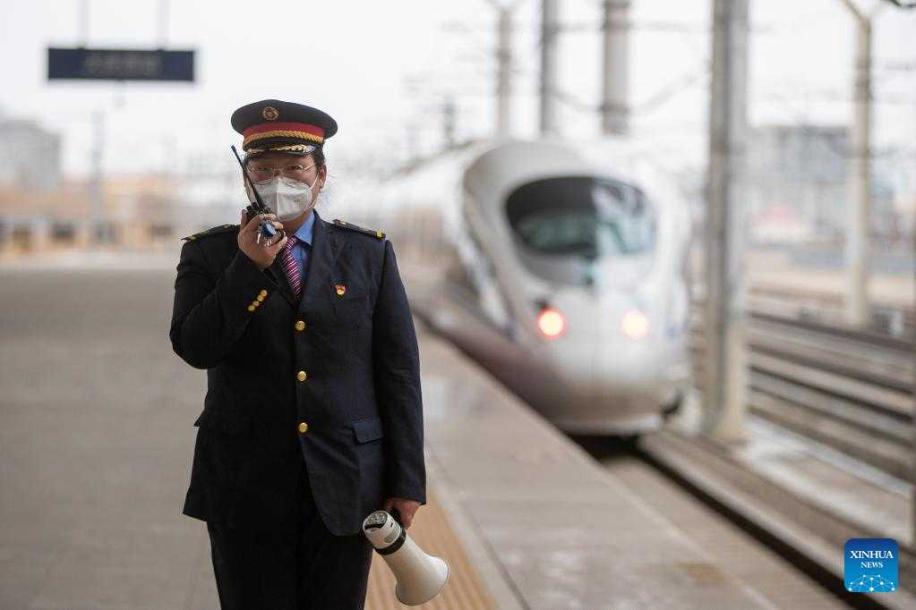 Train station staff member Zhang Jun issues commands to trains entering Daqing West Railway Station in Daqing, northeast China's Heilongjiang Province, March 7, 2023. Enterprises in Heilongjiang Province, an old industrial base in northeast China, have been making headway towards the goal of making a good start in the first quarter of 2023.