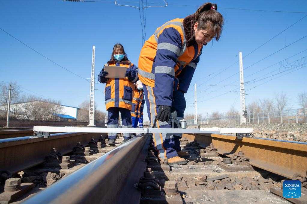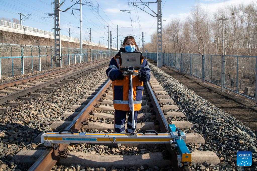 Yuan Pengpeng, a member of a female railway inspection team, works along the Harbin-Manzhouli railway in Daqing, northeast China's Harbin, March 6, 2023. Enterprises in Heilongjiang Province, an old industrial base in northeast China, have been making headway towards the goal of making a good start in the first quarter of 2023.