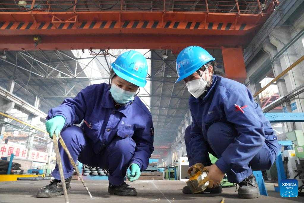 Employees Liu Li (L) and Liu Lili work at Harbin Boiler Company Ltd. of Harbin Electric Corporation in Harbin, northeast China's Heilongjiang Province, March 6, 2023. Enterprises in Heilongjiang Province, an old industrial base in northeast China, have been making headway towards the goal of making a good start in the first quarter of 2023.