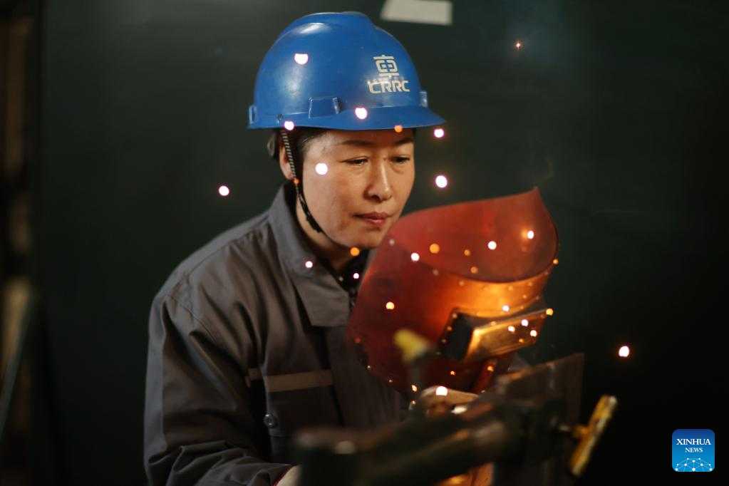 Welder Zhang Jinghua works at China Railway Rolling Stock Corporation (CRRC) Qiqihar Rolling Stock Co., Ltd in Qiqihar, northeast China's Heilongjiang Province, March 6, 2023. Enterprises in Heilongjiang Province, an old industrial base in northeast China, have been making headway towards the goal of making a good start in the first quarter of 2023.