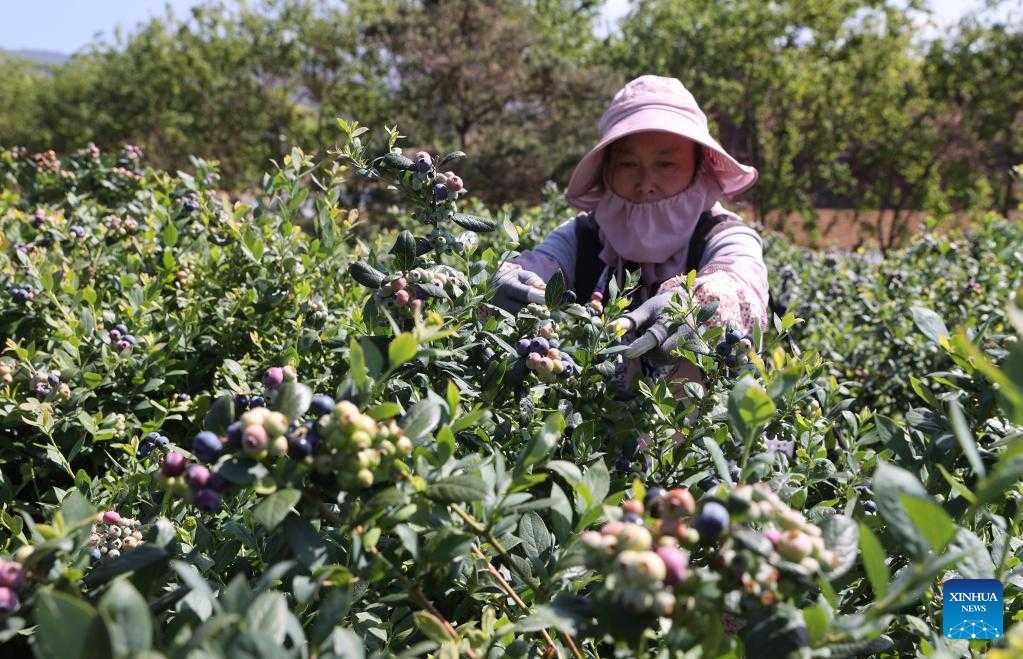 A villager picks blueberries at a planting base in Chengjiang County, southwest China's Yunnan Province, April 4, 2023. Around the time of Qingming Festival which falls on April 5 this year, farmers across the country are busy with farm work.(Xinhua/Liang Zhiqiang)