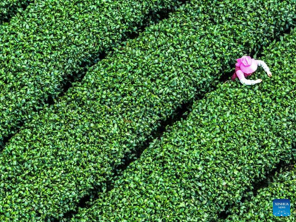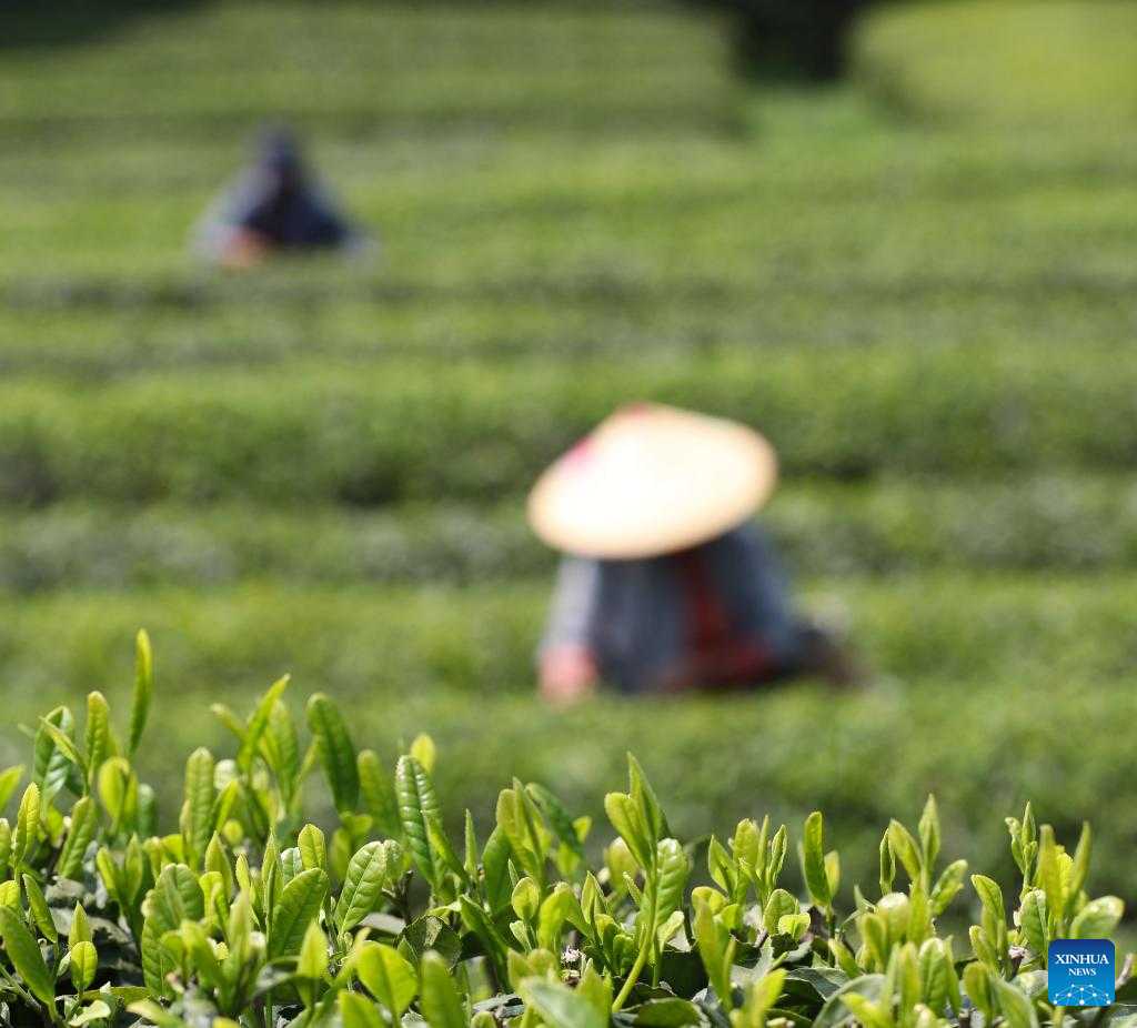A farmer picks tea leaves at a tea plantation in Meitan County, southwest China's Guizhou Province, April 4, 2023. With the tea plantations covering an area of 600,000 mu (40,000 hectares), the tea industry in Meitan County has become the most important pillar industry in local rural economy. Tea farmers are busy picking tea leaves before the Qingming Festival, which falls on April 5 this year, as this is the major harvest period for premium spring tea. (Xinhua/Ou Dongqu)