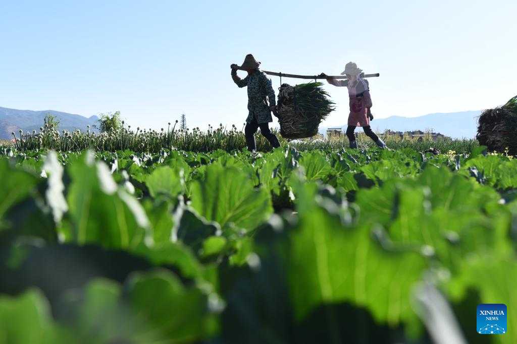 Farmers carry vegetables in the field in Yulong Naxi Autonomous County in Lijiang City, southwest China's Yunnan Province, April 4, 2023. Around the time of Qingming Festival which falls on April 5 this year, farmers across the country are busy with farm work.(Xinhua/Zhao Qingzu)