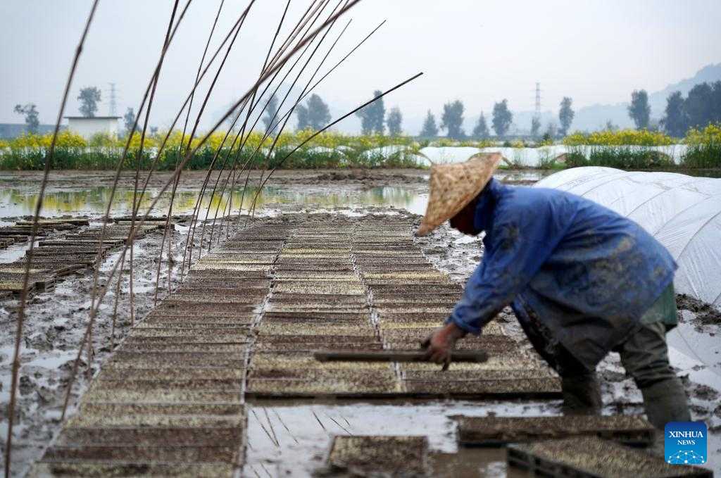 A farmer works in a paddy field in Zhenhai Village of Leqing City, east China's Zhejiang Province, April 4, 2023. Around the time of Qingming Festival which falls on April 5 this year, farmers across the country are busy with farm work.(Xinhua/Cai Kuanyuan)