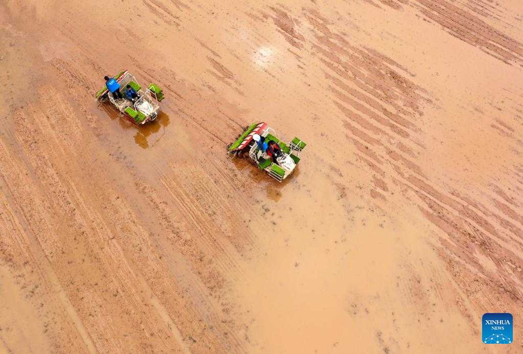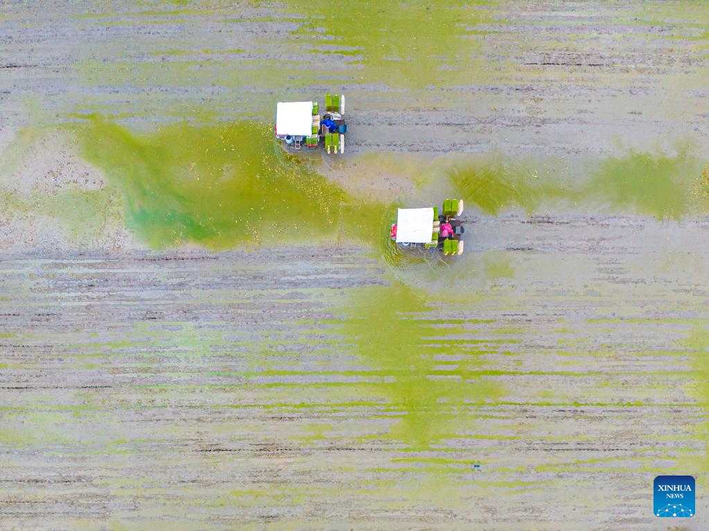 This aerial photo taken on April 4, 2023 shows farmers operating rice transplanters in the field in Yuanshi Township of Linshui County, Guang'an City, southwest China's Sichuan Province. Around the time of Qingming Festival which falls on April 5 this year, farmers across the country are busy with farm work.(Xinhua/Zhang Qifu)