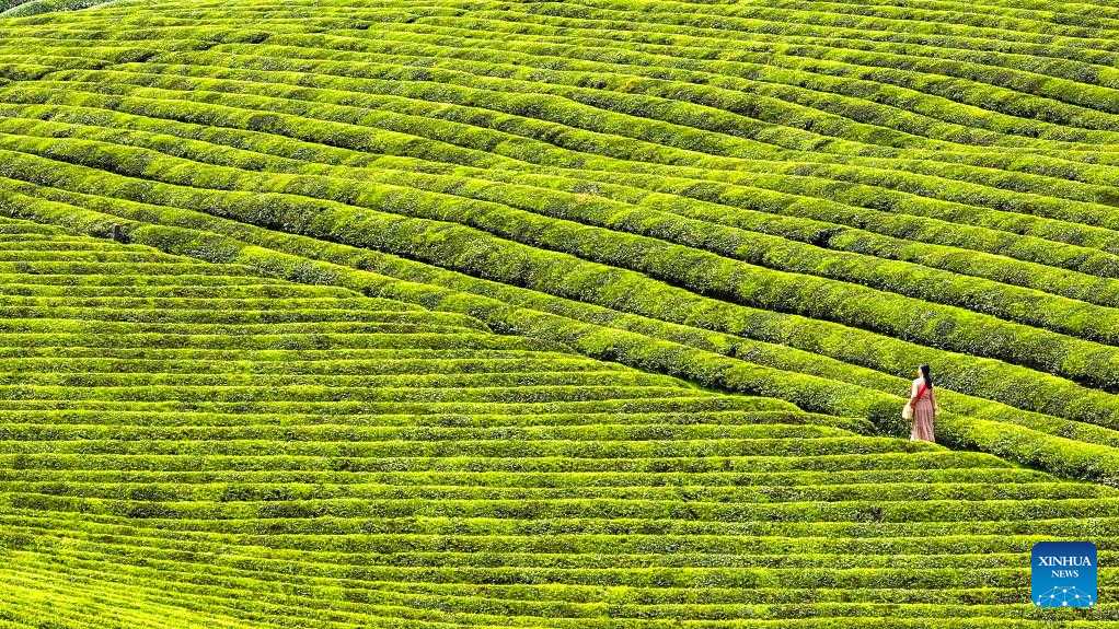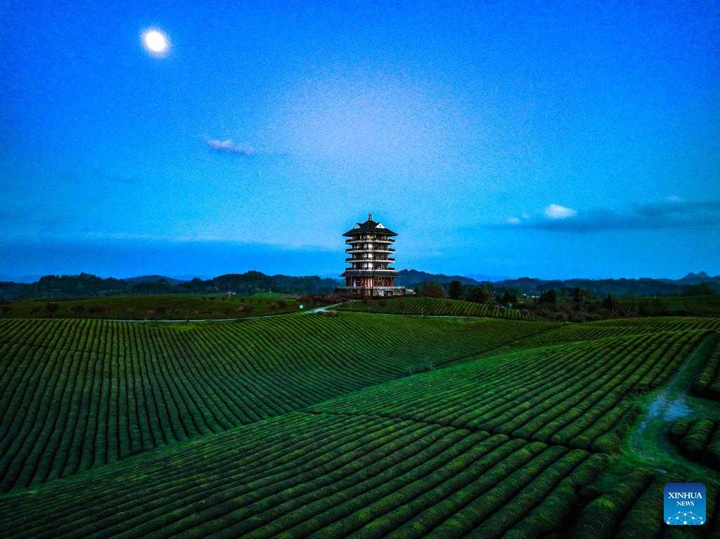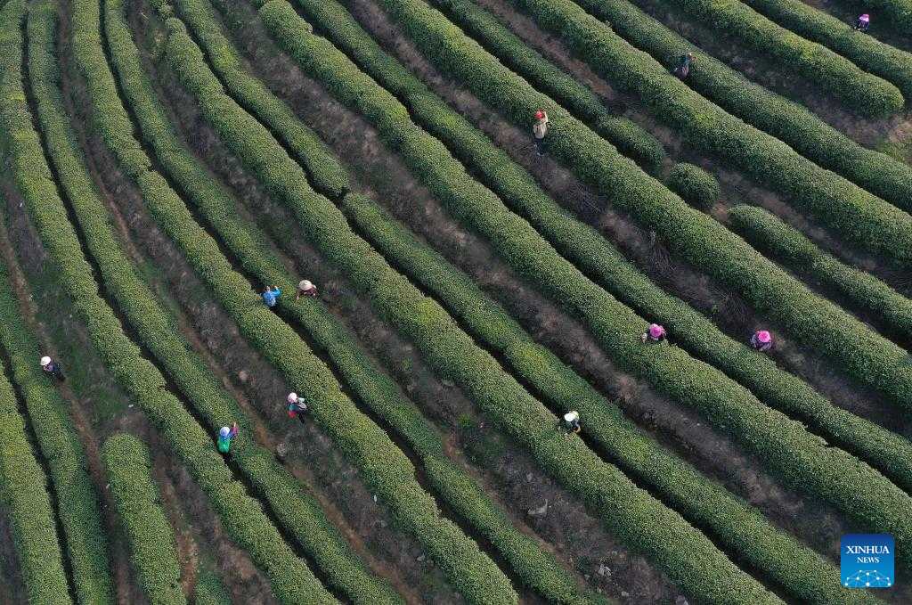 This aerial photo shows tea plantations in Yongxing Town, Meitan County, southwest China's Guizhou Province, April 4, 2023. With the tea plantations covering an area of 600,000 mu (40,000 hectares), the tea industry in Meitan County has become the most important pillar industry in local rural economy. Tea farmers are busy picking tea leaves before the Qingming Festival, which falls on April 5 this year, as this is the major harvest period for premium spring tea. (Xinhua/Ou Dongqu)