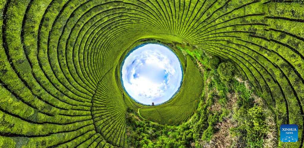 This stitched aerial photo shows tea plantations in Yongxing Town, Meitan County, southwest China's Guizhou Province, April 4, 2023. With the tea plantations covering an area of 600,000 mu (40,000 hectares), the tea industry in Meitan County has become the most important pillar industry in local rural economy. Tea farmers are busy picking tea leaves before the Qingming Festival, which falls on April 5 this year, as this is the major harvest period for premium spring tea. (Xinhua/Ou Dongqu)