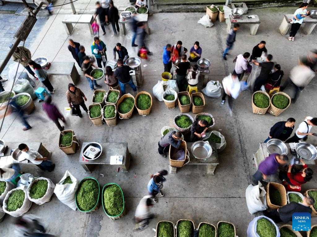 This aerial photo shows people trading tea leaves at a tea market in Meitan County, southwest China's Guizhou Province, April 4, 2023. With the tea plantations covering an area of 600,000 mu (40,000 hectares), the tea industry in Meitan County has become the most important pillar industry in local rural economy. Tea farmers are busy picking tea leaves before the Qingming Festival, which falls on April 5 this year, as this is the major harvest period for premium spring tea. (Xinhua/Ou Dongqu)
